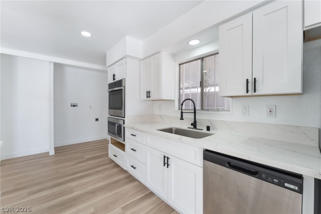 This beautifully renovated 2-bedroom, 2-bath home features a fully updated interior with a bright, open-concept layout. Nestled in a 55+ community this spacious living area showcases brand-new light wood-look flooring, recessed lighting, and oversized windows that fill the home with natural light. The chef-inspired kitchen offers all-new white shaker cabinets, quartz countertops, modern black hardware, a large center island, stainless steel appliances, and a sleek stainless steel range hood. Both bathrooms have been completely redesigned with high-end finishes. Enjoy custom walk-in showers accented with large-format marble-style tile, matte-black fixtures, rainfall showerheads, built-in niches, and elegant frameless enclosures. Each vanity showcases quartz countertops, black faucets, upgraded lighting, and contemporary mirrors?creating a clean, luxurious feel. Outside, the property offers low-maintenance landscaping, covered parking, a wheelchair-accessible ramp at the front entry.